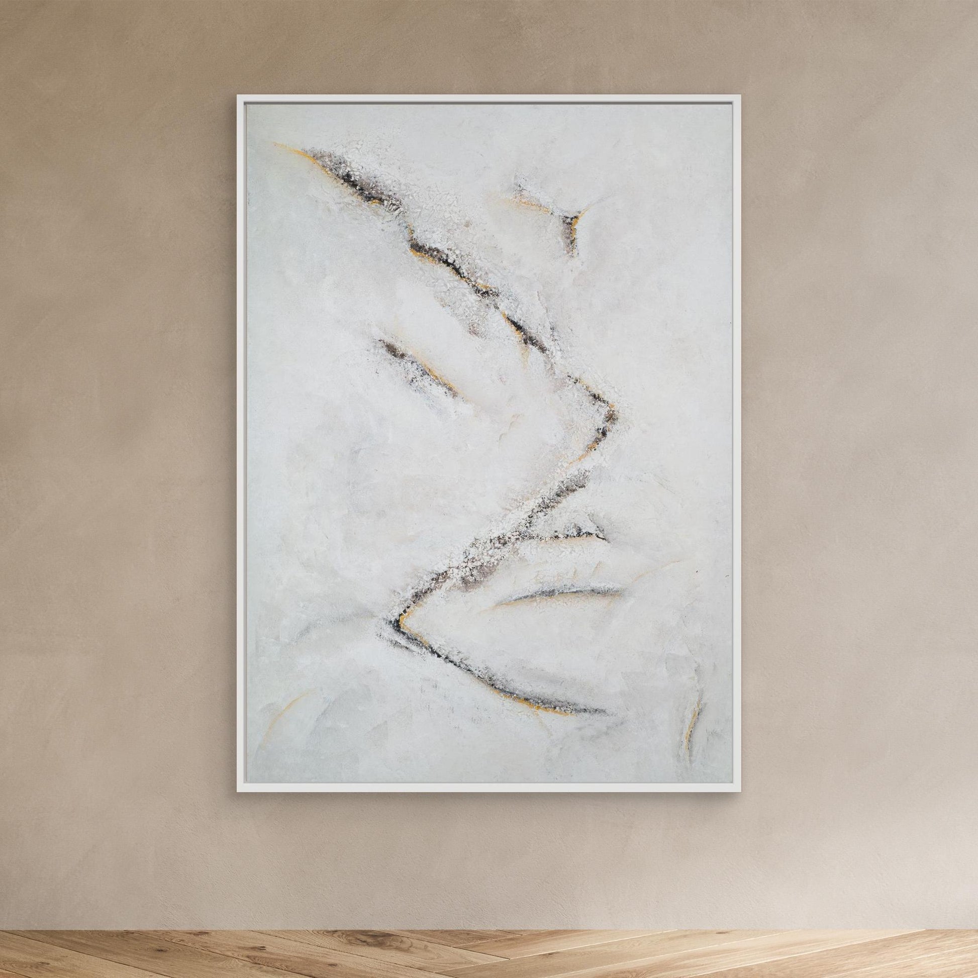 The print captures every detail of the original artwork — soft fractured textures and golden accents that shimmer like something precious left by time. It evokes nature’s slow work: winds carving cliffs, water shaping riverbeds, memories etched in silence.