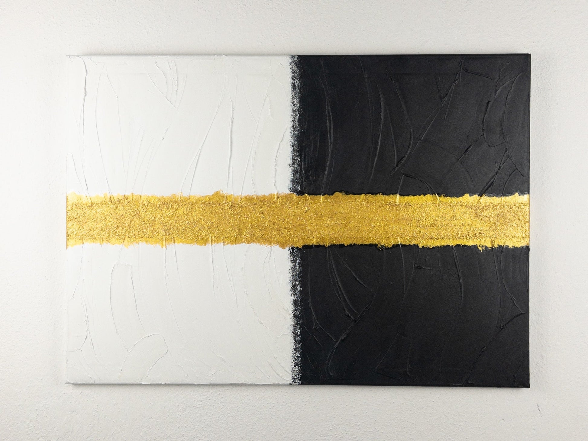 This piece speaks of balance found in contrast. The bold division of black and white is united by a luminous gold path — a reminder that even in opposing forces, there exists a place where everything aligns. The textured strokes invite you to reflect on inner harmony and the quiet strength that comes from standing centered between extremes.