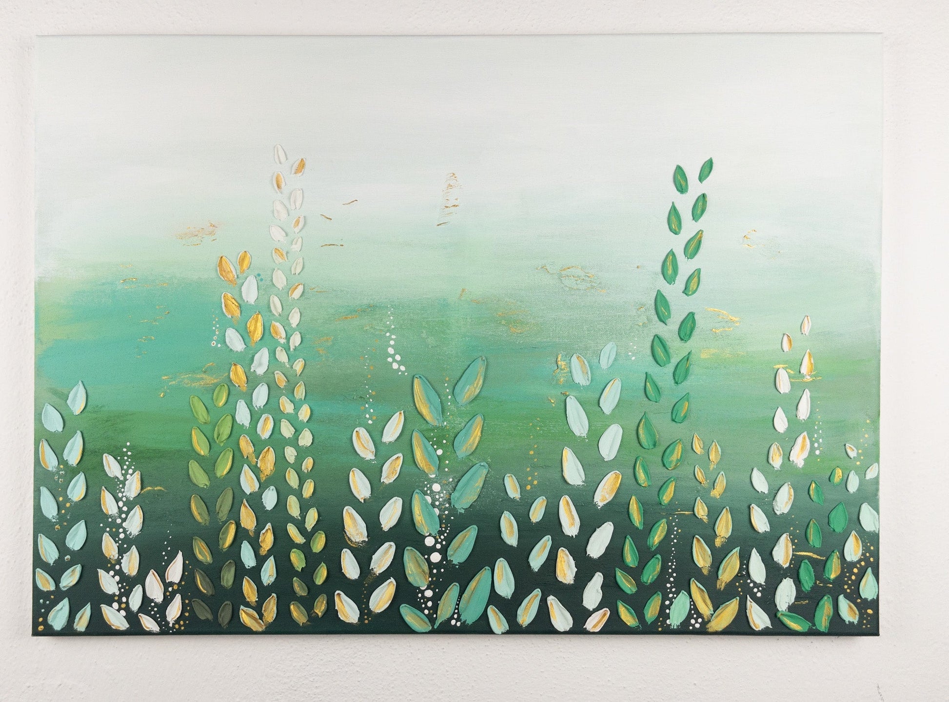 Flourish emerges like an underwater garden, where light filters through shifting currents and life rises quietly toward the surface. The textured forms, like leaves and bubbles, suggest both the tender reach of plants and the drifting rhythm of the sea.