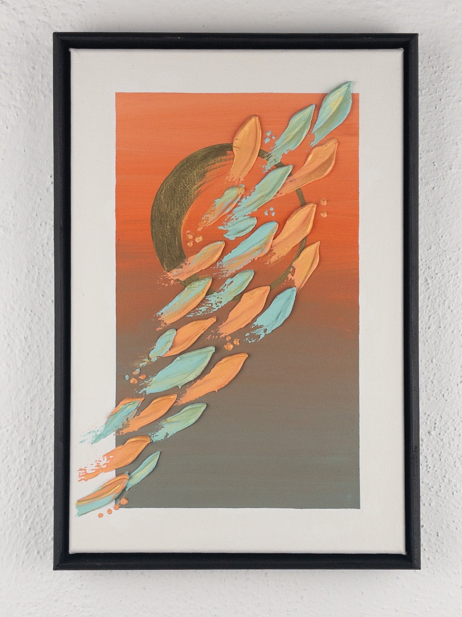 In Flying, shapes lift and swirl as if caught in an unseen current, moving upward through a sky painted in warmth and dusk. Each textured stroke seems to hold both the weight of what anchors us and the lightness of release. The interplay of bold orange, soft blue, and golden accents evokes that fleeting moment when courage takes form — when we choose to rise despite uncertainty.
