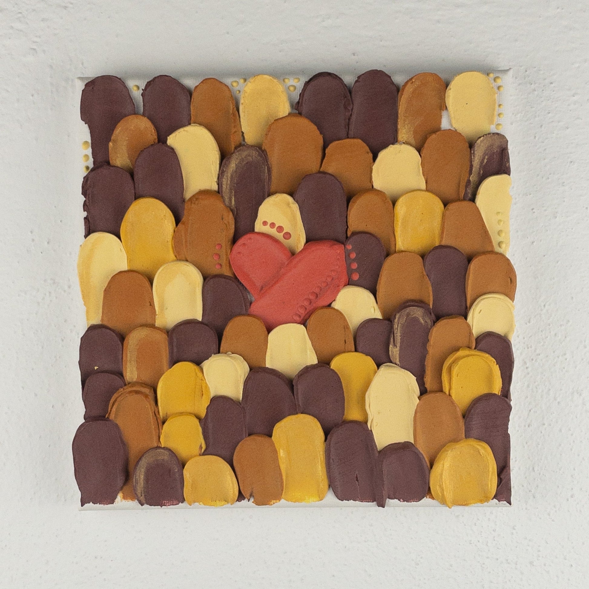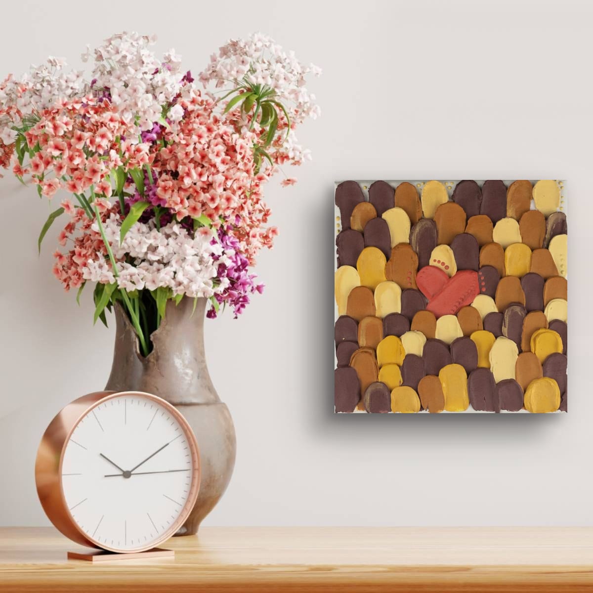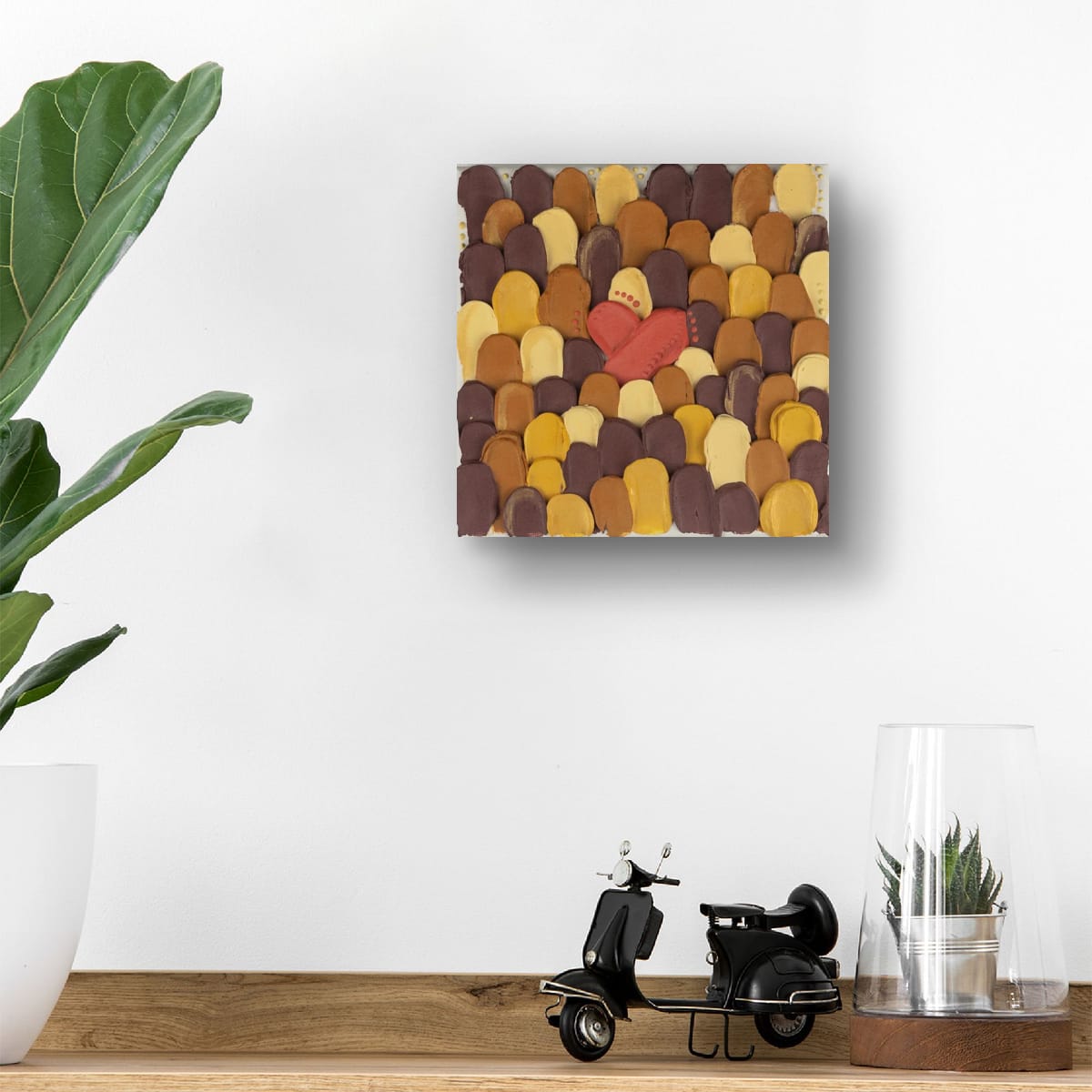 This piece invites the viewer to pause and notice the quiet resilience of love. Amidst a sea of earthy, textured forms — each one distinct yet connected — a singular heart emerges, vibrant and steady. It speaks of courage in standing apart, of tenderness that endures in the midst of life’s crowd.